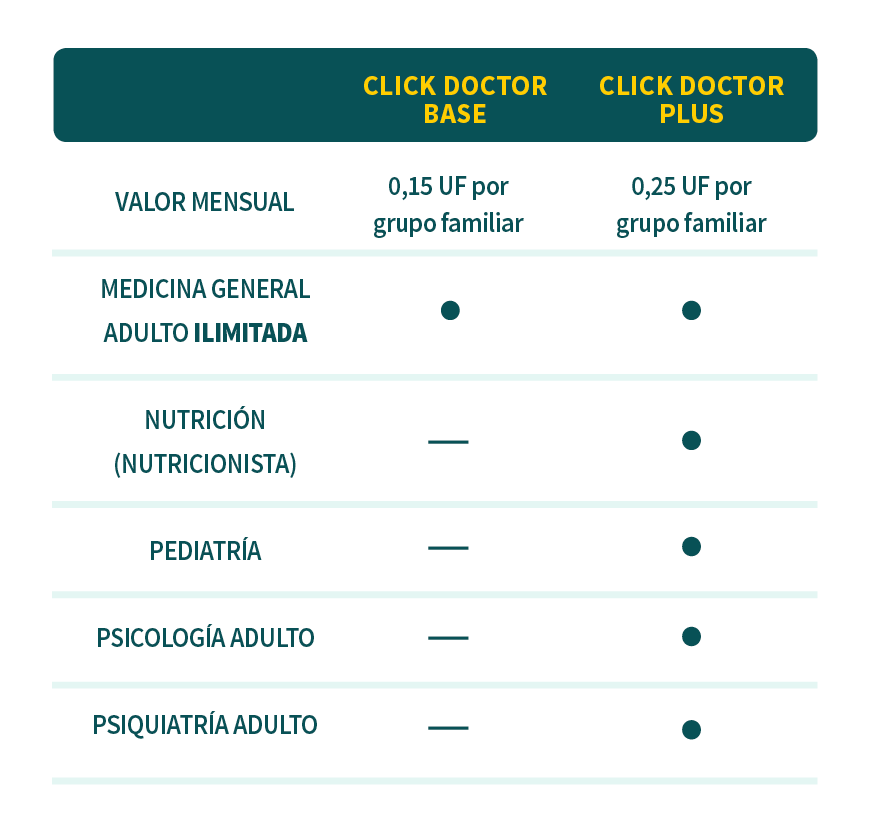 CLICK DOCTOR BASE: Ofrece atención de Medicina General Adulto personalizada de forma online, en la cual el afiliado titular o sus beneficiarios reciben un diagnóstico médico y tratamiento correspondiente, o bien, alguna orientación respecto a cualquier dolencia de salud que posean en cualquier momento del día, los 7 días de la semana y los 365 días del año.